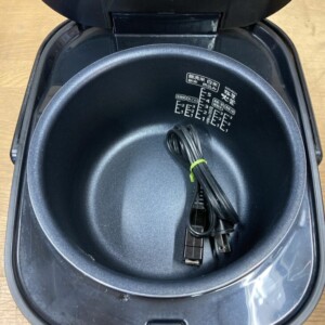 お預かりしたRC-ME50-Bは、天面に軽い擦り傷やくすみ、側面にも細かなスレが見受けられる状態でした。一方で内釜は大きな剥がれもなく、文字の印字も明瞭で、実用上は問題のないコンディションです。動作確認では炊飯・保温ともに正常に動作し、付属品として電源コードも揃っていました。