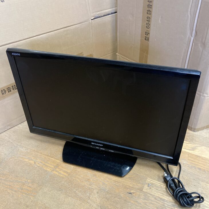 お預かりしたLC-22K20は、フレームや背面パネルに日常使用による細かな擦り傷やうっすらとしたスレが見られましたが、液晶画面には目立つキズやドット抜けはなく、映像表示も良好でした。スタンド部分にも多少のスレはあるものの、ぐらつきはなくしっかり自立します。電源コードは付属しており、地上デジタル放送の受信やHDMI入力など主要機能に問題がないことを確認しました。一方でリモコンが欠品していたため、その点は評価を控えめにしています。