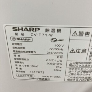 福岡県柳川市にてSHARP除湿機 CV-T71-Wを出張買取 きれいな状態の2025年製で適正価格にて査定しました