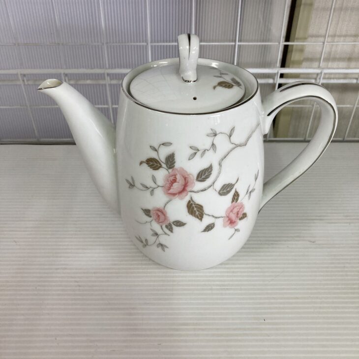 お送りいただいたナルミの陶器ポットは、外観に通常使用に伴う薄い擦れや僅かな汚れが見られる状態でした。割れや大きな欠けは確認されず、蓋の取っ手部分や注ぎ口の縁も比較的きれいに保たれていました。ポット底面の「NARUMI CHINA」刻印もはっきりと残っており、内部も使用感はあるものの著しい汚れは見られません。年代は不明ですが、ローズ柄があしらわれた人気シリーズの一つで、コレクション・日常使い両方に適した陶磁器製品です。