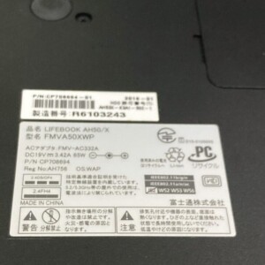 お買取したノート型PCはLIFEBOOK AH50/Xで、全体的に動作は問題ないものの、外装に汚れや細かな傷が見受けられる状態でした。白い筐体は使用による黒ずみが出やすくキーボードやパームレスト付近に使用感が確認できました。画面は破損はなく表示も問題ありませんでしたが、年式が経過していることも踏まえ総合的に状態の判断を致しました。
