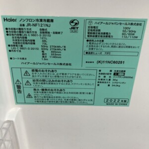 東京都豊島区でハイアール JR-NF121NJ(2022年製)冷凍冷蔵庫を出張買取 比較的きれいな状態のため適正価格で査定しました