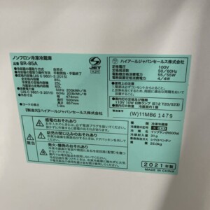 お預かりしたBR-85Aは外装に細かな擦り傷が複数見られる状態でした。庫内は棚板・ケース類が揃っており清潔感のある良好な状態で、冷凍室・冷蔵室ともに動作は正常でした。製造年が2021年と比較的新しいため、再販価値は十分に見込めるモデルでした。