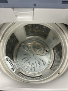 お預かりした洗濯機は、外装にやや小さな擦れ傷が確認できましたが、洗濯槽内部は全体的にきれいな状態でした。異音や動作不良もなく、基本機能は良好。排水ホース・給水ホースも揃っており、動作に必要な付属品が残っている点は評価につながりました。