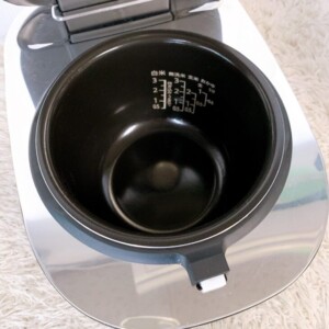 お送りいただいた炊飯器は、全体的に比較的きれいな状態で、天面に光の反射で見える程度のわずかなスレやくすみがありました。内釜は大きな剥がれもなく、炊飯メモリも鮮明で、丁寧に使用されていたことがうかがえる状態でした。電源コードも揃っており、動作確認でも問題はありませんでした。