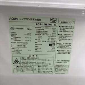 今回は日光市にお住まいの30代・男性より、AQUAの冷蔵庫 AQR-17M(2022年製)を出張買取にてご依頼いただきました。168Lの容量で単身から二人暮らしに向いた使い勝手の良いモデルで、庫内の透明パーツや棚板も揃っており、全体的にお手入れが行き届いた印象でした。