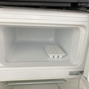 外観はホワイトカラーで、扉の大きなへこみや目立つ傷はありませんでした。冷凍室には製氷皿が残っており、内部の割れも見られません。冷蔵室も棚板が揃っており、ケース類の欠品はありませんでした。全体的に清潔に保たれているものの、年式が2016年製のため経年使用による細かなスレや使用感は確認されました。