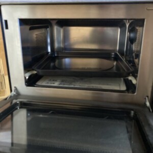 お送りいただいたオーブンレンジは、庫内・外装ともに使用感はあるものの比較的きれいな状態でした。庫内の焦げ付きや大きなへこみはなく、付属の角皿も揃っていました。背面のコード類は固定された状態で、全体として動作確認も問題ありませんでした。