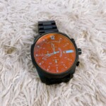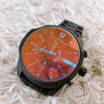 今回お買取した腕時計DIESEL DZ4280は、全体的に使用感がある状態で、裏蓋には擦れと曇りが見られ、ブレスレット部分にも細かな傷やコーティングの摩耗が確認できました。文字盤のオレンジカラーは鮮明ですが、ケースには軽度の擦り傷が多く長期間の使用がうかがえるコンディションです。動作は問題なくクロノグラフの針も正常に可動していましたが、付属品(箱・取扱説明書)は無い状態でした。