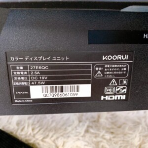 ご依頼いただいたKOORUI 27E6QCは、画面に薄い指紋跡や使用によるスレが見られる状態でした。背面にもやや擦れがありますが、スタンドはしっかりとしており、通電・表示ともに動作は良好。付属ケーブルも揃っていました。