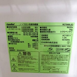 今回は都城市にお住まいの40代男性より、Comfee(コンフィー)冷蔵庫 RCT90BL(E)(2024年製)の出張買取をご依頼いただきました。お住まいは賃貸アパートで、単身利用とのことです。