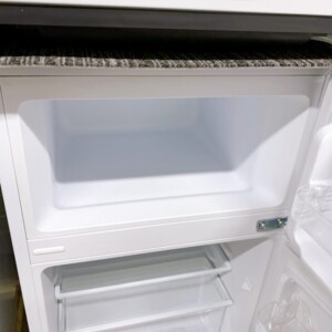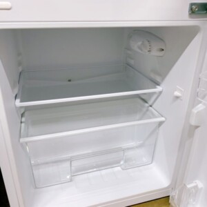 こちらの冷蔵庫はコンパクトタイプ(全容量87L)で、冷凍室・冷蔵室ともに清潔感のある良好な状態を保っていました。冷凍室・冷蔵室ともにトレーやドアポケットに破損・汚れは見られず、外装にも大きなキズやへこみは確認されませんでした。動作確認の結果、冷却機能にも問題はなく、家庭用冷蔵庫として再販売が可能な状態です。