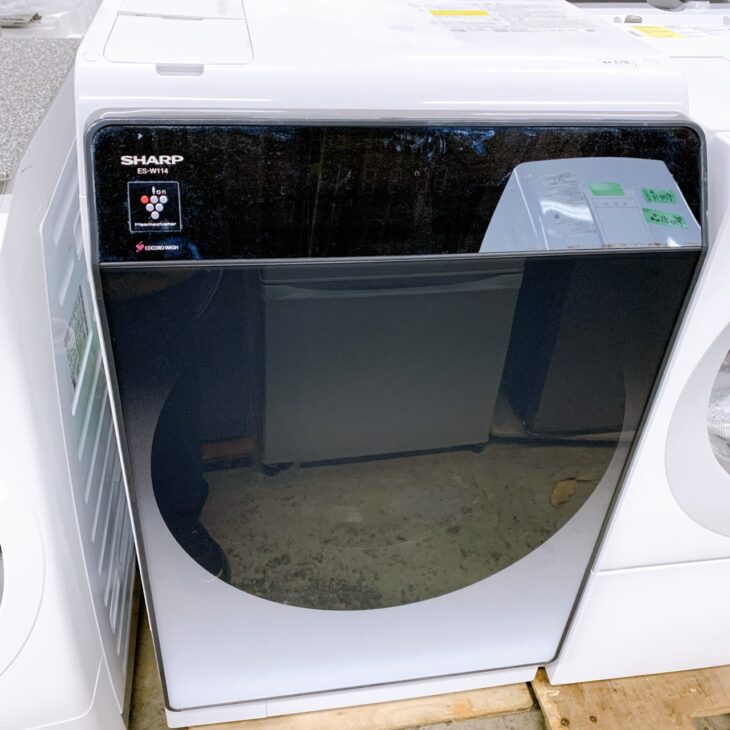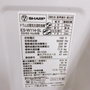 SHARP ES-W114-SLは11kg洗浄・6kg乾燥の高容量モデルで、中古市場でも人気の高い機種です。パネルに細かな使用感はあるものの、庫内の状態が良く、付属品が揃っていたことが大きく評価につながりました。