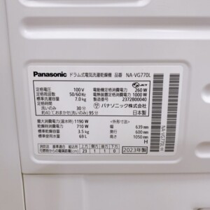 お引き取りしたNA-VG770Lは、全体的に使用感の少ない良好な状態でした。外観には大きな傷やへこみは見当たらず、ドラム内部も清掃されておりカビや汚れも少ない印象です。洗濯・乾燥の動作も正常で、付属品も一式揃っていました。