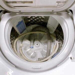 本体外観には使用に伴うわずかなスレや薄い汚れが見られましたが、大きく目立つへこみはなく、年式のわりに良い状態を保っていました。槽内部は比較的きれいで、汚れの付着は少なく、乾燥フィルターなどのパーツも問題なく使用できる状態でした。