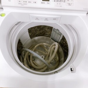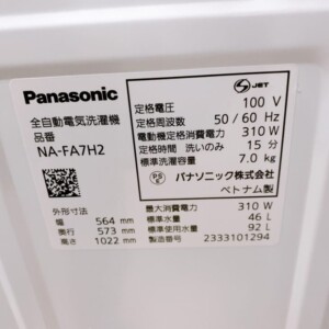 お預かりしたNA-FA7H2は、外観・操作パネルともに大きな傷や汚れがほとんど見られない良好な状態でした。槽内も清潔で、糸くずフィルターや給水ホースなどの付属品も揃っていることを確認しました。使用感はあるものの、丁寧に扱われていた印象で、中古市場でも評価の高いポイントです。