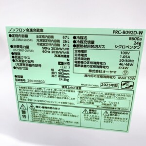 大阪府羽曳野市にてアイリスオーヤマ PRC-B092D-W 2025年製の冷蔵庫を出張買取 きれいな状態のため適正価格で査定しました