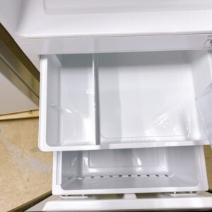 お預かりしたHR-G13C-BRは、外装の鏡面ドアに大きな傷やへこみはなく、全体的にきれいな状態でした。庫内も棚板や野菜ケースに破損は見られず、日常的に丁寧に使用されていたことがわかる良好なコンディションです。冷凍室も清潔で、使用感はあるものの不快な汚れはありませんでした。