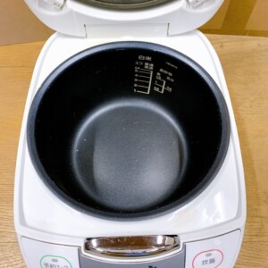 ご依頼いただいた炊飯器は、通電および炊飯ボタン操作を確認したところ基本動作は問題なく使用可能な状態でした。外観は比較的きれいでしたが、内部の内釜には細かな擦れやコーティングの薄れが見受けられ、年式相応の使用感がありました。また、天面や側面には軽度の擦り傷が確認できましたが、使用上の支障はありません。付属品については電源コード一体型のため欠品はありませんでした。