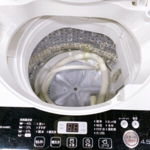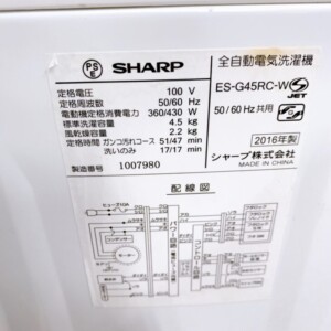 お預かりしたES-G45RC-Wは、外装に細かな擦れや使用に伴う小傷がみられ、内槽にもやや水垢が残る状態でした。ただし動作は問題なく、給水ホース・排水ホースが揃っている点は評価できる内容でした。年式が2016年とやや経過していますが、単身向け容量4.5kgモデルとしては中古市場で一定のニーズがあります。