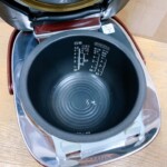 お預かりしたRC-10VSLは、トップパネルに細かな擦り傷や使用感が複数見られる状態でした。外観の赤いトップ部分にはやや目立つ傷があり、内釜にもコーティング剥がれが確認できるなど、経年による摩耗が見受けられました。動作自体は問題なく、炊飯や各モードも正常に機能していました。