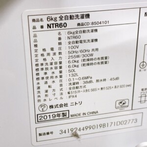 今回は小田原市にお住まいの30代女性・会社員の単身世帯のお客様より、ニトリ 6kg 全自動洗濯機 NTR60(2019年製)の出張買取をご依頼いただきました。