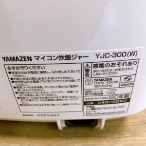 YAMAZEN YJC-300(W) は0.54Lのコンパクトモデルとして需要があり、一人暮らしの方を中心に中古市場で安定した動きを見せる製品です。外観に多少の使用感があるものの、動作良好・付属品完備・内釜状態が比較的きれいな点を評価いたしました。
