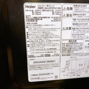 今回は野田市にお住まいの30代女性より、Haier(ハイアール)のヘルツフリー電子レンジ JM-XP2FH18G(2024年製)を出張買取にてご依頼いただきました。ご自宅は賃貸マンションの親子世帯で、家電の買い替えに伴い不要となった電子レンジの整理を希望されていました。