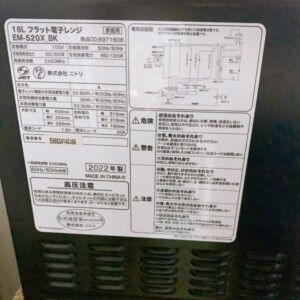 今回は西尾市にお住まいの40代女性・会社員より、ニトリ 18Lフラット電子レンジ EM-520X_BK(2022年製)を出張買取にてご依頼いただきました。お住まいは賃貸アパートで、単身で生活されているお客様です。