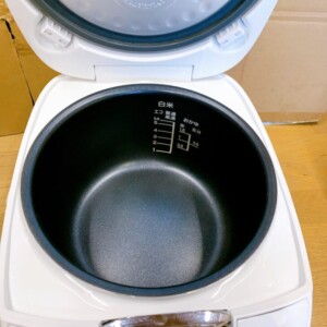 炊飯器は中古品として一般的な使用感があり、本体外装には軽いスレが見られました。内釜には薄いコーティング跡がありますが、深い剥がれはなく十分使用できる状態でした。動作確認では炊飯・保温・メニュー切り替えのすべてが正常に作動し、2025年製ということもあり機能面は良好でした。