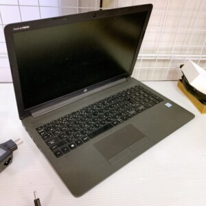 お預かりしたHP 250 G7は、外観の天板に細かな傷が複数見られる使用感のある状態でした。底面にも軽い擦れが確認できましたが、電源投入・キーボード反応・無線接続など基本動作は問題なく、実務用途として十分利用できるコンディションでした。付属品は本体とACアダプターの2点で、取扱説明書や箱は付属していませんでした。