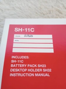 お送りいただいたSH-11Cは、外箱・付属のバッテリーパックSH23、卓上ホルダSH32、取扱説明書が揃ったセット品でした。外箱には経年による軽いスレはありましたが、内部の付属品や携帯本体は使用感の少ない良好な状態で、年代物としては大変保存状態の良いお品でした。