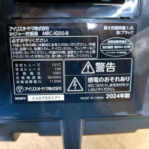 お預かりしたMRC-IG50-Bは全体として使用感が少なく、特にうち窯がきれいな状態で保たれていました。IH加熱の動作も問題なく、外装にも大きな傷や汚れは見られませんでした。2024年製という比較的新しい年式である点も、査定において大きなプラスとなりました。