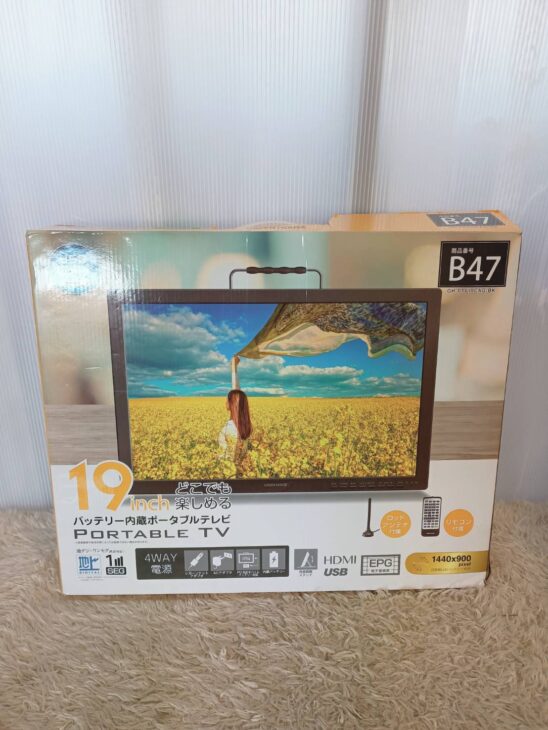 お送りいただいたポータブルテレビは、外箱付きで全体的にきれいな状態でした。箱には保管による軽いへこみが見受けられましたが、本体の動作確認では映像・音声とも問題なく、アンテナ受信、USB再生、HDMI入力など各種機能も正常に使用できる状態でした。リモコンや付属アンテナなどの付属品も揃っていたため評価の高い商品です。