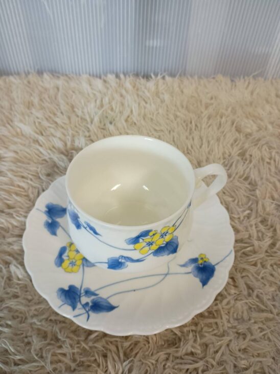 お送りいただいたカップ&ソーサーは、ひび・欠けのないきれいな状態で保管されており、使用感も比較的少ない印象でした。艶もしっかりと残っており、ノリタケ特有の上品な白さと軽やかな質感が感じられる一品です。華やかなブルーとイエローの花柄がデザインされた人気のシリーズで、市場でも一定の需要があるアイテムです。
