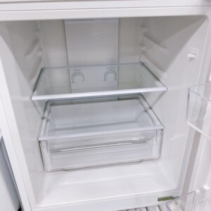 お預かりしたAQR-14R(W)は、外装・庫内ともに目立つ傷や汚れが少ない良好な状態でした。庫内の棚やケースも割れ・欠けがなく、付属の製氷皿もそのまま残っていました。内部の温度調整ダイヤルやトレー類もきれいに保たれており、総じて使用感が少なめの印象でした。
