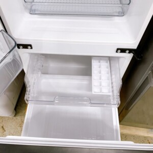 お預かりしたSJ-D15J-Hは、外装の前面にわずかな擦れが見られるものの、庫内は棚やケース類がきれいに保たれており使用感の少ない状態でした。冷蔵室・冷凍室どちらも割れや変形はなく、製氷皿も残存しているため再販時の評価としてプラスにつながるコンディションでした。