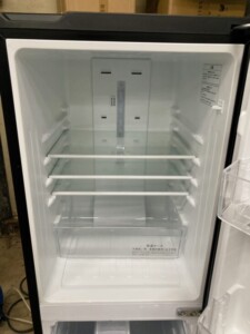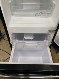 HR-D15CBは150Lクラスのコンパクト冷蔵庫で、冷蔵室のガラス棚・低温ケース・冷凍室のトレイなど、内部は比較的良好な状態を保っていました。外観については前面に小さなスレや使用に伴う細かな傷が見られたものの、大きなへこみや割れなどは確認されず、動作にも問題はありませんでした。
