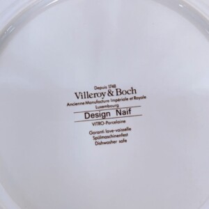 お品物は、表面にカトラリー跡や細かな擦れが見られるなど、日常使用による使用感が確認できました。一方で、欠けやヒビ、割れはなく、絵柄部分の色あせも少ない状態でした。裏面のバックスタンプから、Villeroy & BochのDesign Naif(デザイン・ナイーフ)シリーズであることを確認しております。