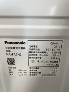 群馬県藤岡市にてPanasonic 全自動洗濯機 NA-FA7H2 7.0kgを出張買取|使用感少なめで状態良好のため適正価格で査定