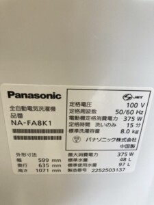 福岡県福岡市でPanasonic 全自動洗濯機 NA-FA8K1(8.0kg)を出張買取|使用感少なめ・動作良好のため適正価格で査定