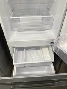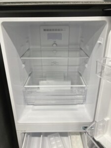 お預かりした冷蔵庫は、外観に使用に伴う細かな擦れ跡が一部見られるものの、大きなへこみや目立つ傷は確認されませんでした。庫内は棚板・ケース類が揃っており、清潔感のある状態です。冷蔵・冷凍ともに動作確認は良好で、温度調整機能も問題なく作動していました。
