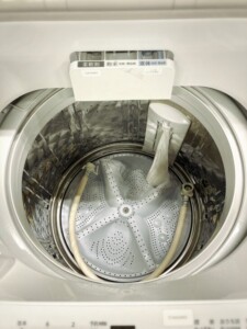 外観は全体的に目立つへこみや大きな傷は見受けられず、天面・操作パネル周辺ともに良好なコンディションでした。細かく確認すると、設置や使用に伴うごく軽微な擦れはあるものの、外観評価に大きく影響するレベルではありません。洗濯槽内はステンレス槽に強い水垢や汚れは見られず、給水ホース・排水ホースも付属していました。動作確認では洗い・すすぎ・脱水まで問題なく稼働しています。