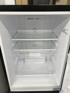 外観はブラックカラー特有の反射があるため分かりやすく、正面ドアおよび側面に使用に伴う擦れ傷や薄い線傷が確認できました。へこみや塗装剥がれといった大きなダメージはなく、設置環境による生活傷の範囲と判断しています。庫内は棚・ケースともに欠品はなく、汚れやニオイの残りも見られない清潔な状態でした。冷蔵・冷凍ともに動作確認を行い、冷却性能に問題はありません。