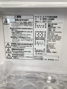 今回は千葉県袖ヶ浦市にお住まいの30代男性より、ニトリ 2ドア冷凍冷蔵庫 NTR-140BK(2024年製)を出張買取にてご依頼いただきました。