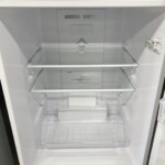 外観はブラックカラー特有の反射があるため分かりやすく、正面ドアおよび側面に使用に伴う擦れ傷や薄い線傷が確認できました。へこみや塗装剥がれといった大きなダメージはなく、設置環境による生活傷の範囲と判断しています。庫内は棚・ケースともに欠品はなく、汚れやニオイの残りも見られない清潔な状態でした。冷蔵・冷凍ともに動作確認を行い、冷却性能に問題はありません。