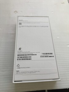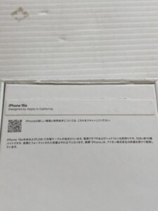 お預かりしたiPhone16eは、未使用・箱付きの状態でした。外箱に大きな潰れや破れはなく、保管に伴うわずかな擦れが見られる程度です。内容物は本体とUSB-C充電ケーブルが揃っており、IMEI・シリアル表記も確認できました。初期状態が維持されており、通電や動作面の問題は一切ありません。