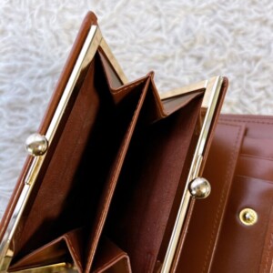 お送りいただいたバーバリーの二つ折り財布は、外側のノバチェック柄部分に目立つ大きな汚れや破れはなく、全体的にきれいな印象でした。一方で、内側のレザー部分には小銭入れ周辺を中心に使用に伴うスレや色ムラが確認できました。がま口金具は開閉に問題なく、留め具の緩みも見られませんでした。