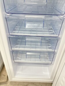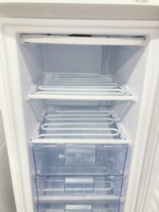 お預かりした冷凍庫は、庫内・外観ともに目立つ傷やへこみは見受けられず、全体的に非常にきれいな状態でした。棚や引き出しパーツの欠損もなく、冷却動作・通電確認も問題ありません。使用年数が浅い2022年製である点も評価につながりました。