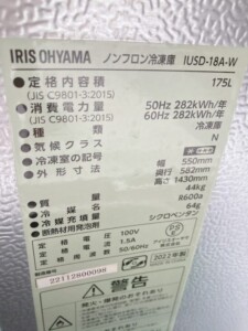 埼玉県坂戸市へ出張買取 IRIS OHYAMA ノンフロン冷凍庫 IUSD-18A-W 2022年製 美品のため高評価で査定しました